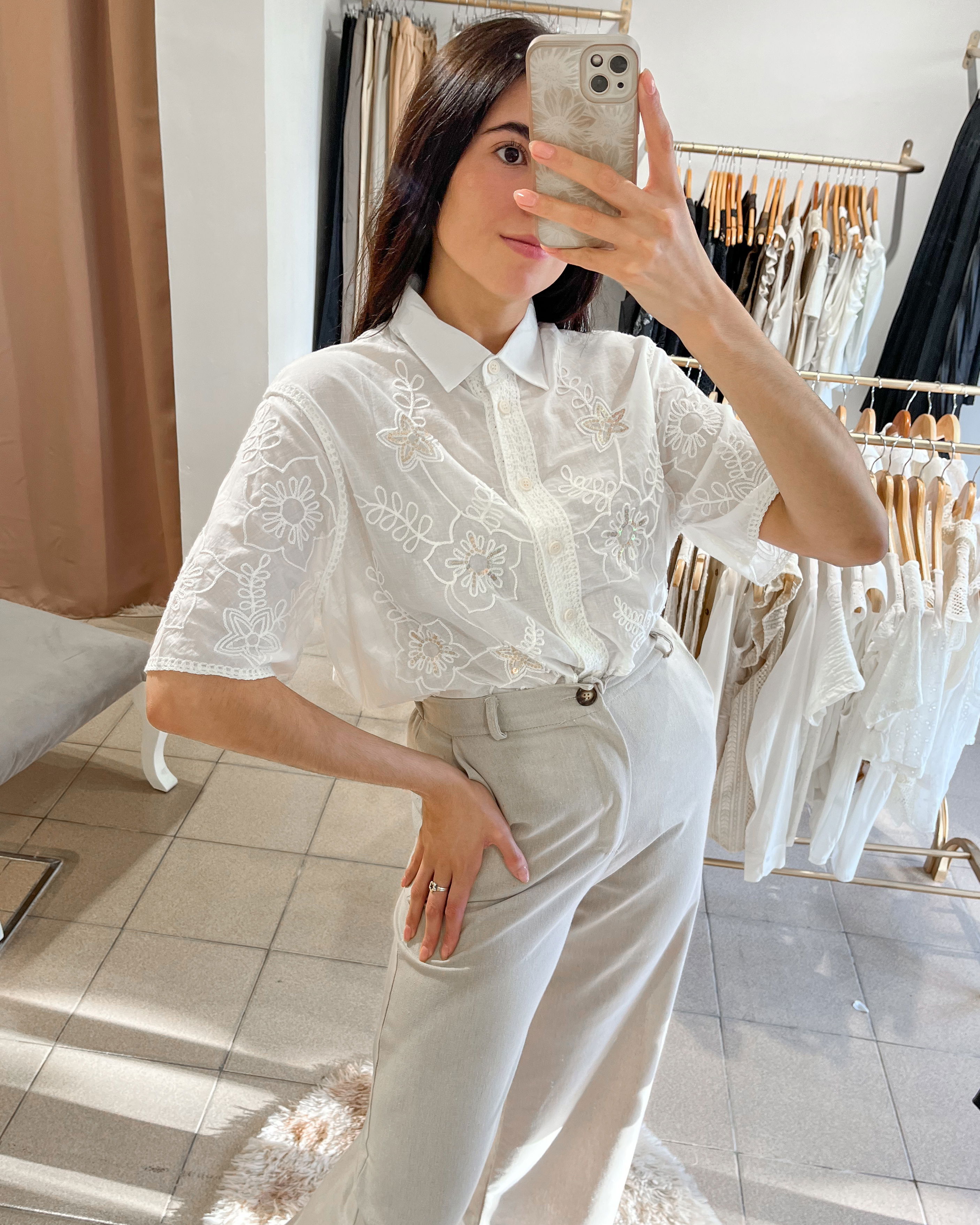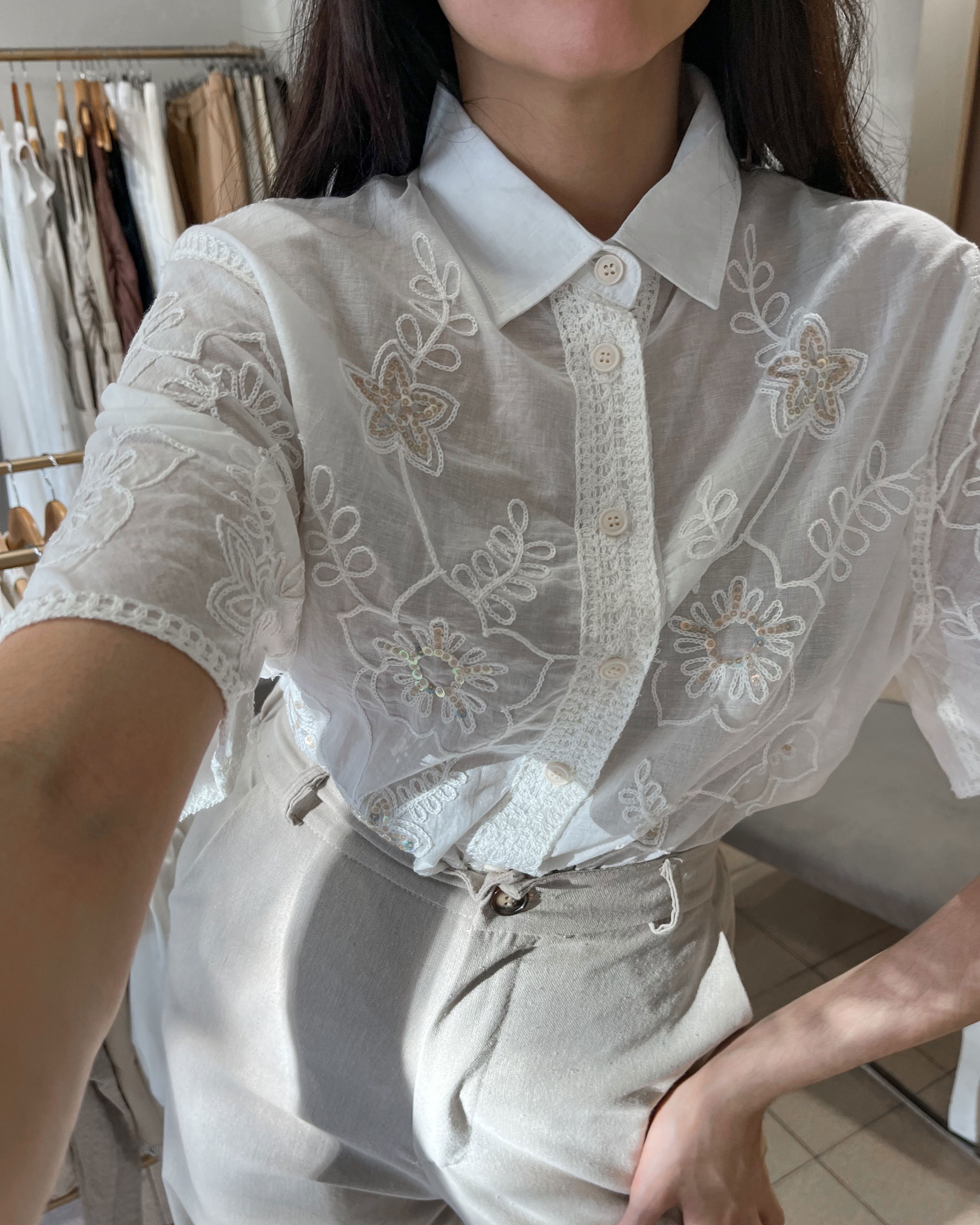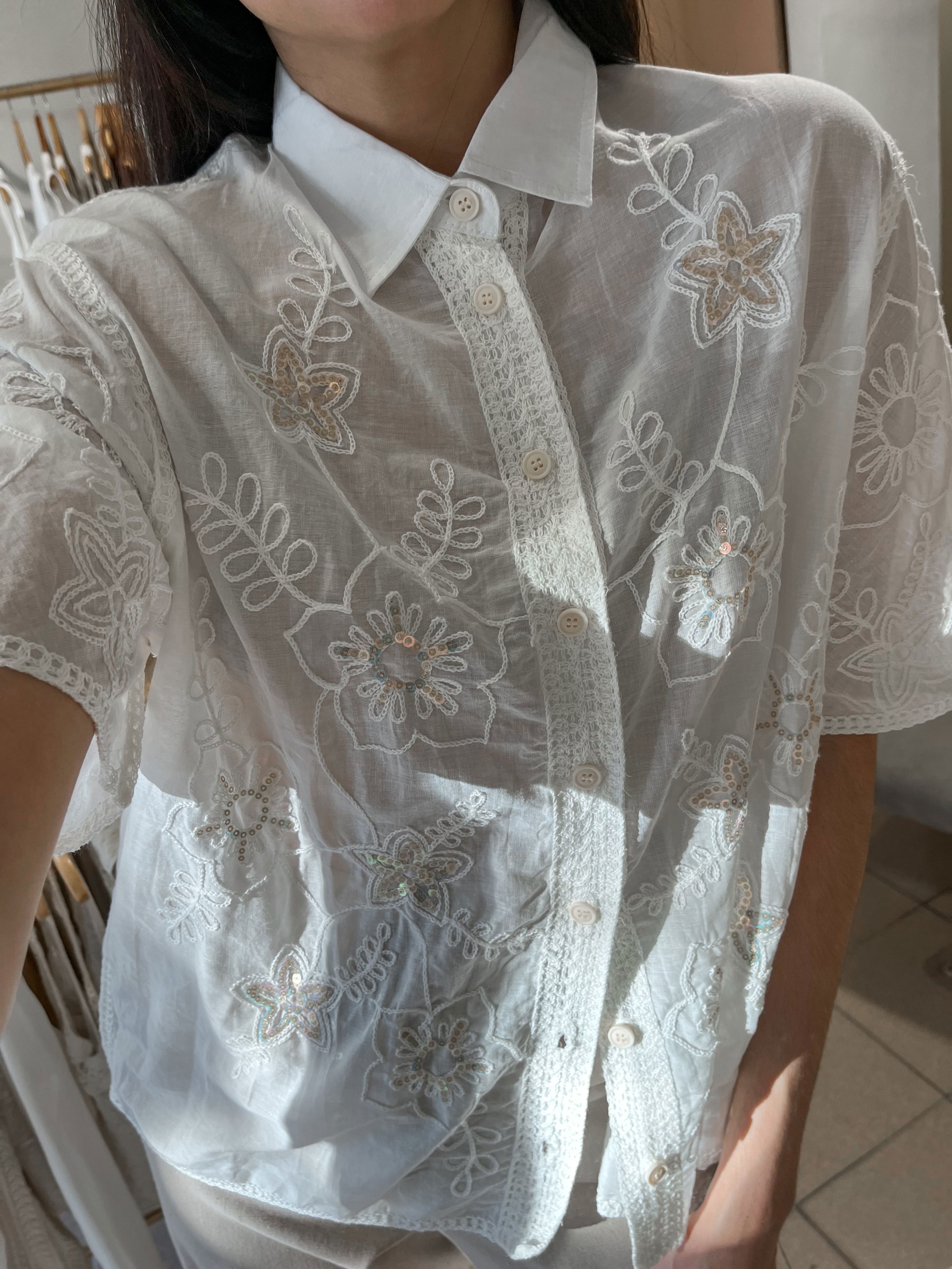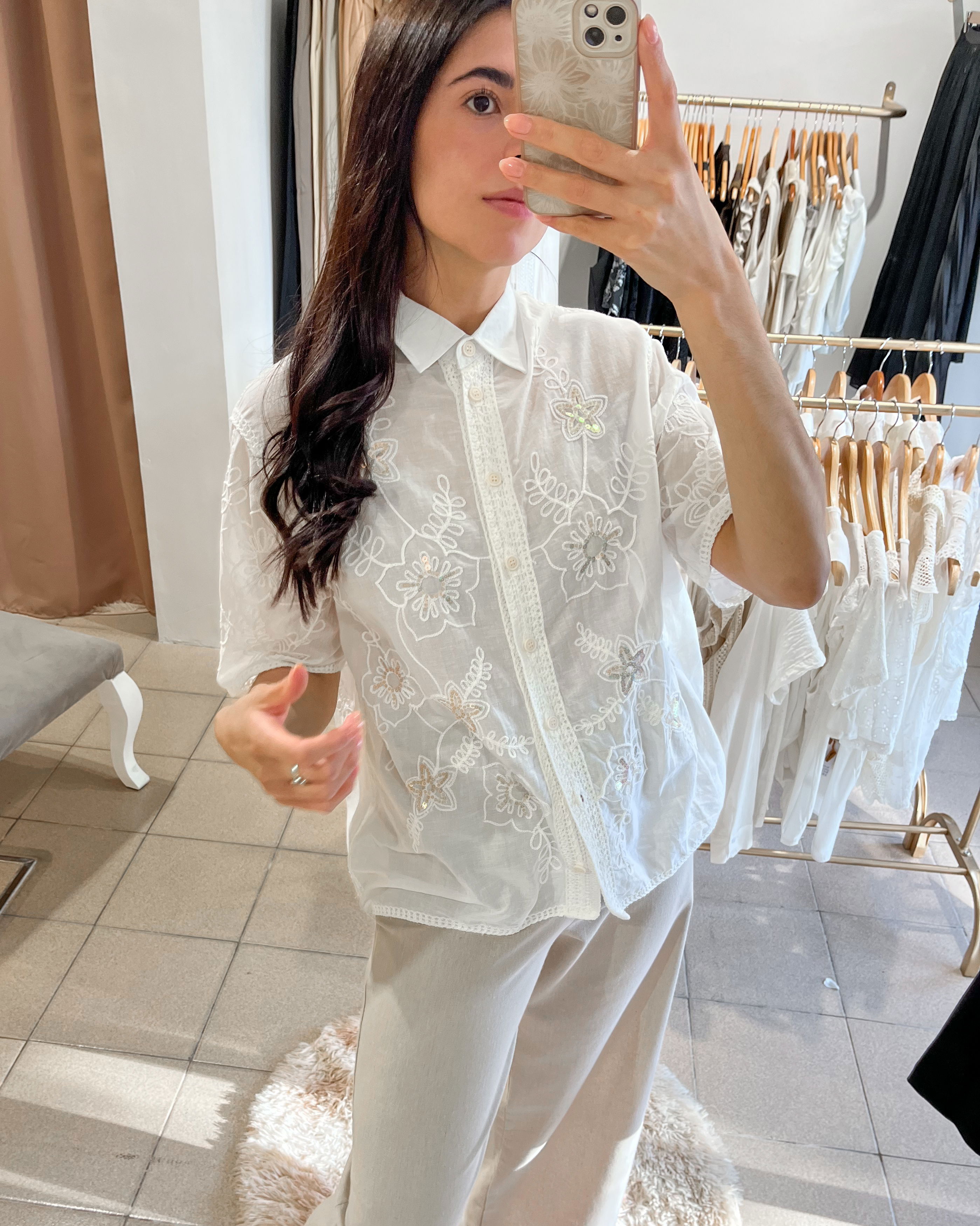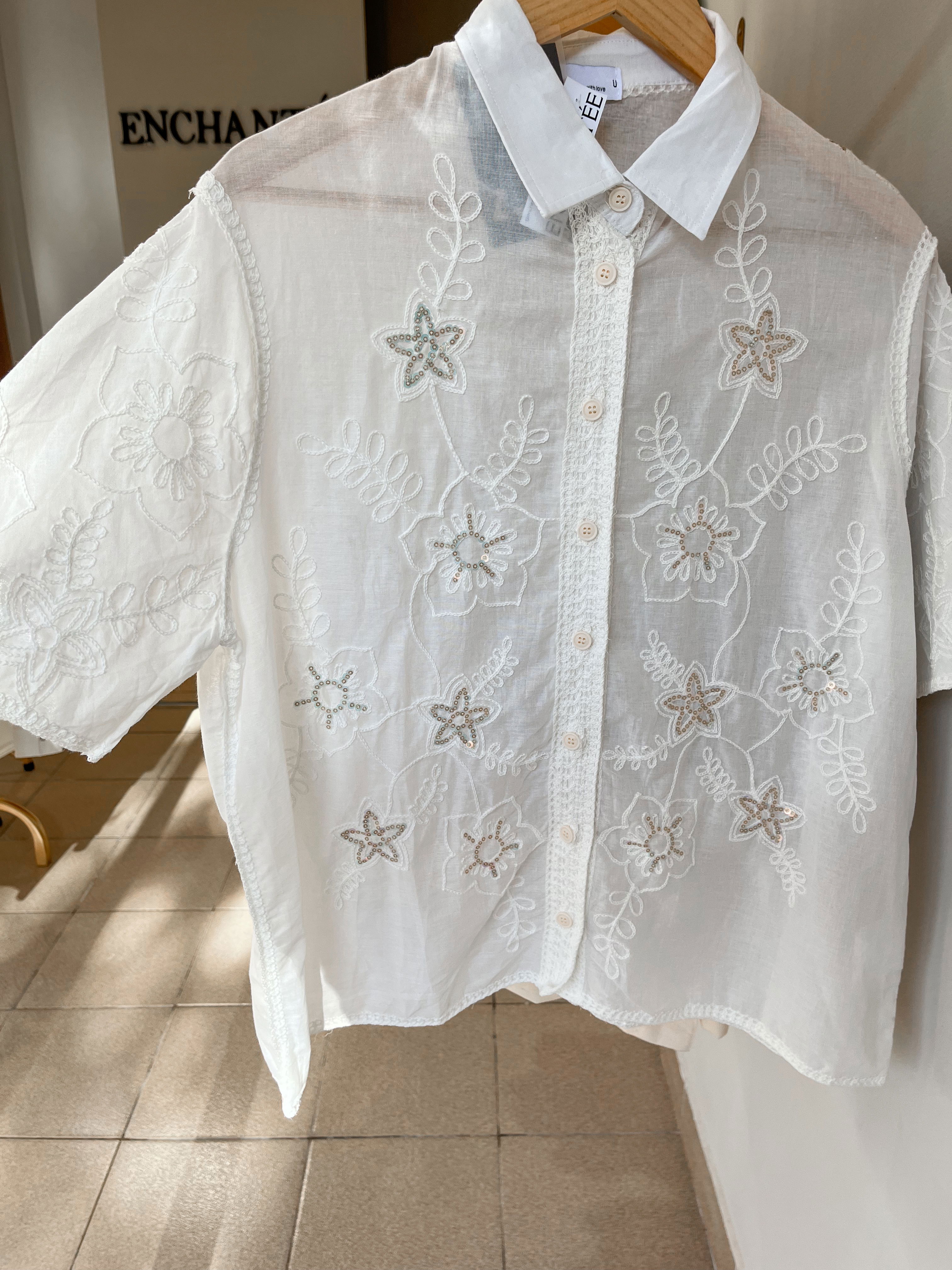 Camisa mangas cortas bordada con lentejuelas tornasoladas.