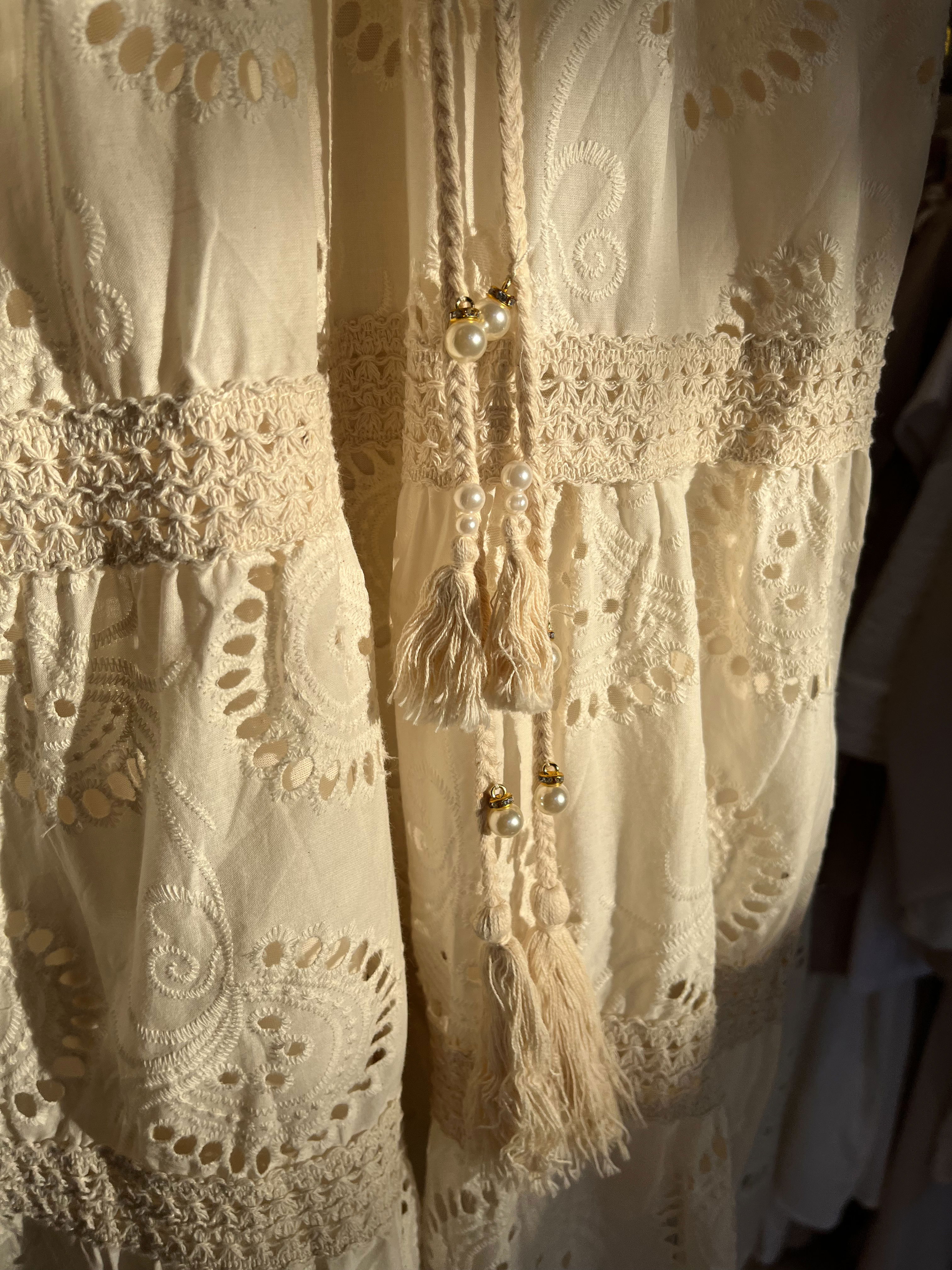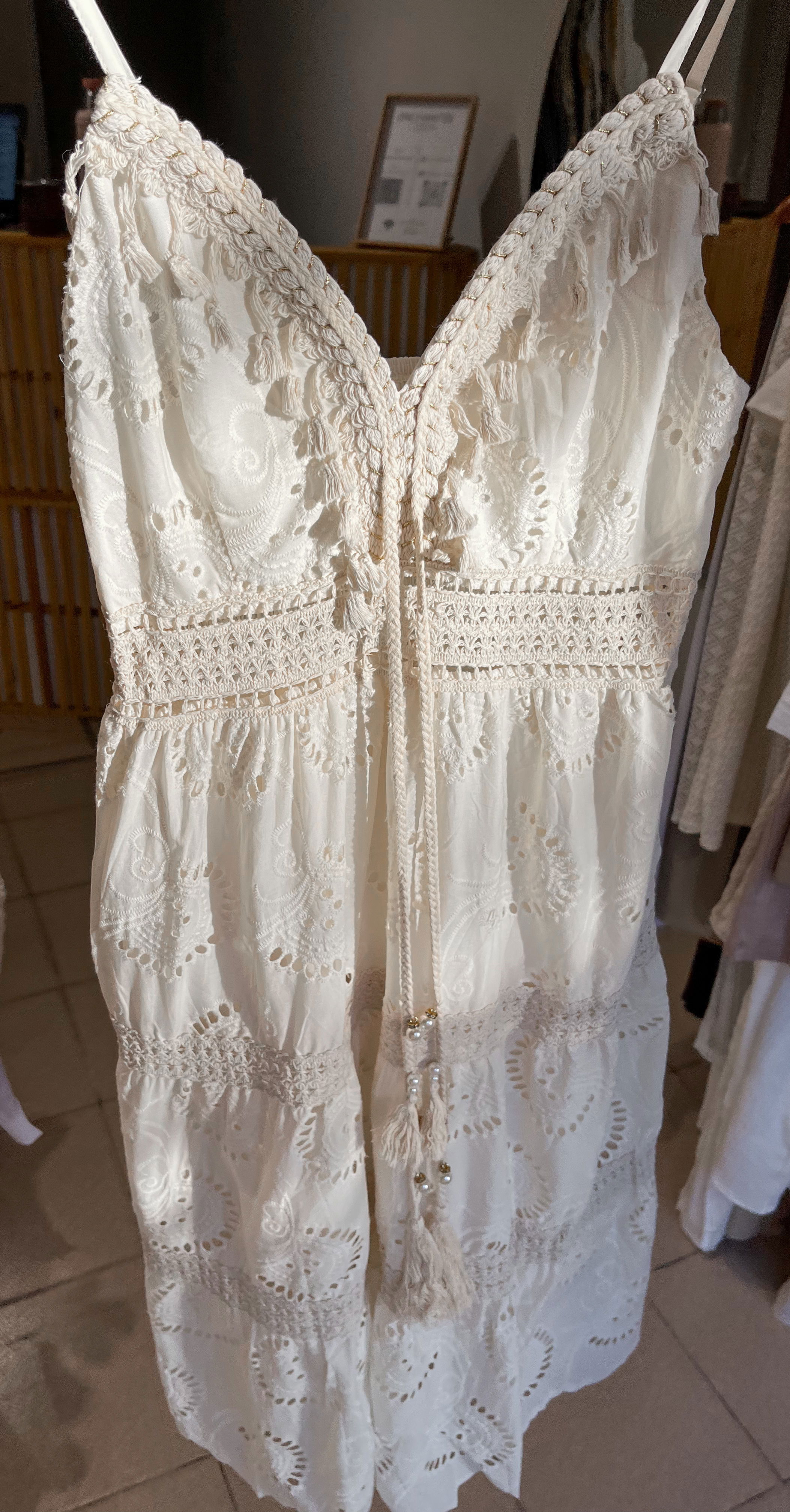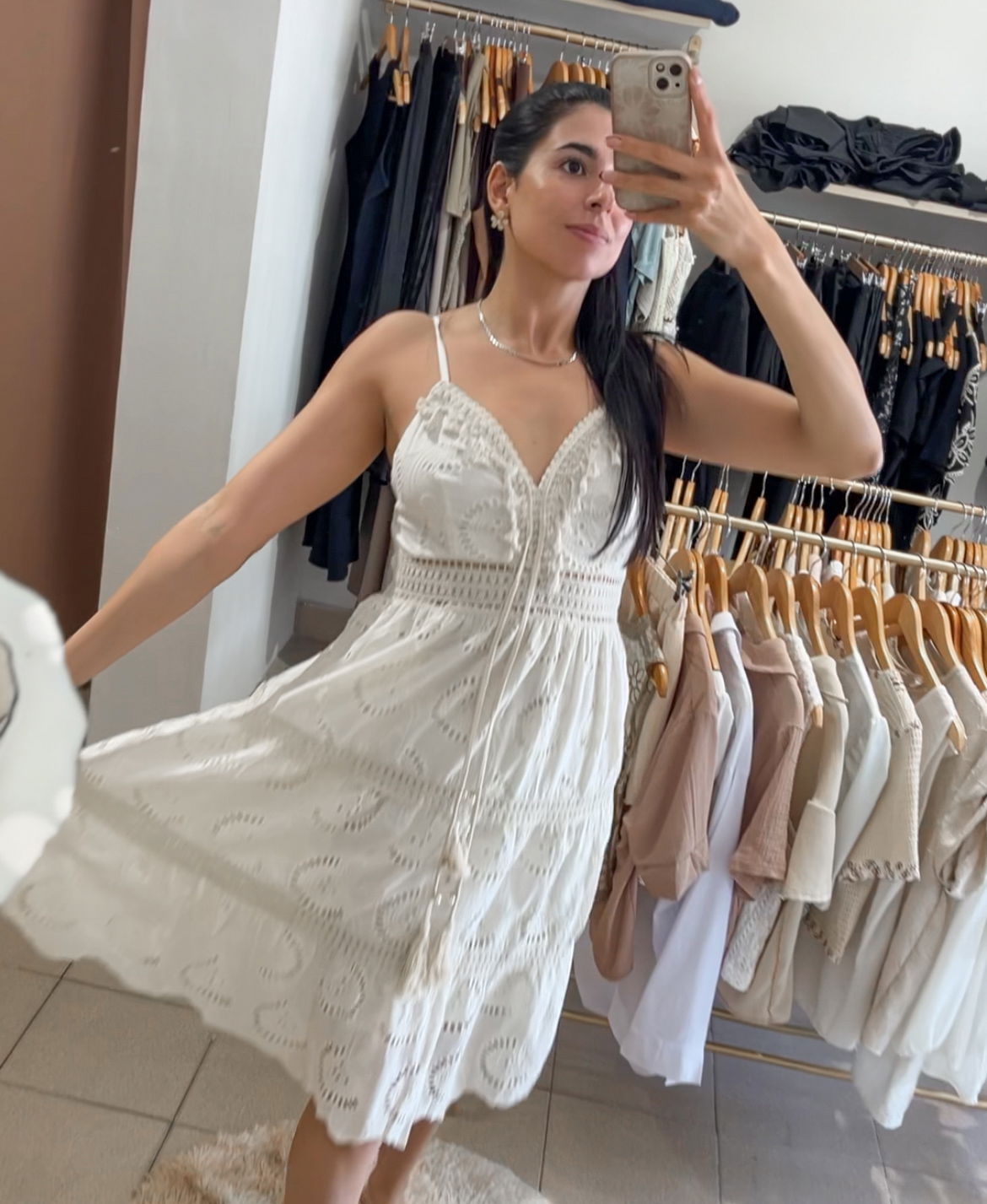 Vestido corto con trama arabesca, espalda elastizada y breteles regulables.